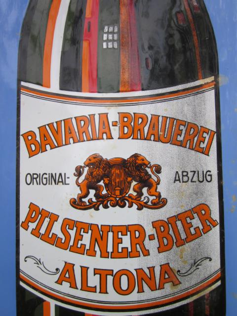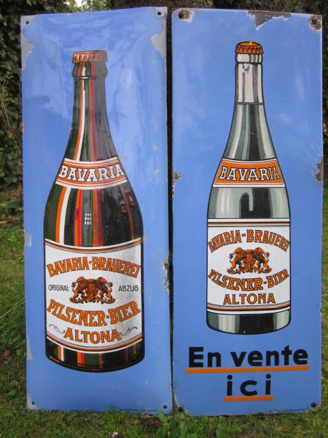 Bavaria aus St. Pauli, Aschaffenburg und Hof sind ja sehr gut bekannt, aber Bavaria aus Altona hatte ich bis dato noch nicht gesehen. Ich glaube die Ladeklappe des kleinen LKW auf dem Flohmarkt in Brüssel letztes Wochenende war noch nicht ganz unten, da hatte ich die beiden Schilder schon in den Händen und spürte sofort mehrere „interssierte Blicke“ einiger „Freunde“ im Nacken. Ich hörte noch wie einer der „Nackensitzer“ dem Verkäufer sagte, dass er die Schilder für den ausgerufenen Preis nehmen würde.  Also (obwohl nicht so günstig) leider nix mehr mit Handeln und kurzum nach Bauchgefühl einfach zugeschlagen.