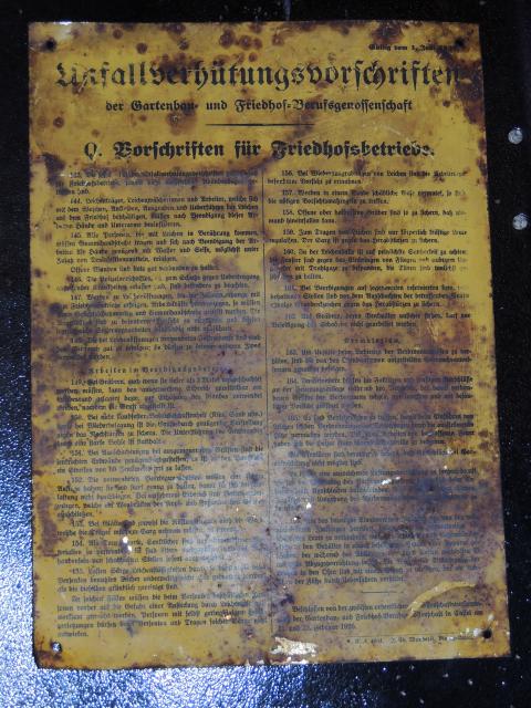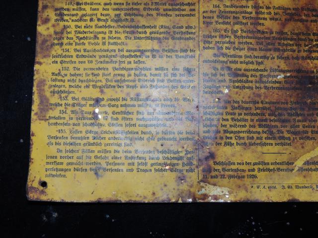 Hallo , nachdem vor Wochen Arbeitschutzvorschriften und Anfang Dezember die Amputation incl.Brandy Werbung gezeigt wurde, hier nun die Vorschrift für das Ende – Vorschrift für Friedhofsbetriebe, gültig vom 1. Juni 1926. Unter Punkt 155 ist zb. zu lesen : “ Lassen Särge Leichenflüssigkeiten durch, so dürfen die beim versenken benutzten Tücher anderwertig nicht eher gebraucht werden als bis dieselben grünglich gereinigt sind. “ Das Schild hat die Größe 25cm x 35 cm, hergestellt von I. Ed. Wunderle Mainz Kastel, ist aber leider nicht mehr im besten Zustand. Falls jemand Interesse hat, ich würde es eventuell vertauschen, gruß miremus