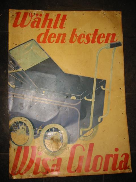 heute aus dem alteisen gefummelt :-)…. visa gloria macht seit 1882 kinderwagen spielzeug und anderes, bis heute….. 🙂 daher hatte ich eine riesenfreude, als ich neben dem eisenhaufen dieses  blechschild sah, mit 70×50 cm ein schon recht grosses blechschild, das modell stammt wohl aus den 30 er jahren…. den unzähligen nagellöcher aber der noch recht guten farbe nach zu urteilen wurde das schild seitenverkehr als abdeckung missbraucht und zum überleben… gesichert montiert…