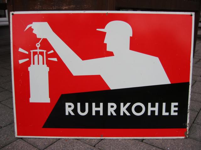 Jau, der Hofnar hat zwar nicht genau getroffen, aber weil man im Norden eben mehr Gas und weniger die Kohle kennt, lassen wir das mal gelten – „Ruhrkohle“ ist die Lösung. Dieses flache Blechschild (52 x 37) ist mal wieder ein Beweis, dass weniger mehr ist. Super einfacher und doch wirkungsvoller Entwurf – evtl. ist der Typ ja sogar ein Reviersteiger 😉