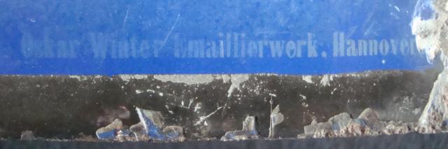 Vorsichtig wurde mit Ako-Pads losgeschrubbert. Wunderbar, der Dreck und auch der Rost gehen runter. Jedoch auch die schwarze Emaille. In weiten Bereichen ist sie richtig mürbe und man kann sie mit dem Fingernagel runterpulen. Die Klaremaille ist hier praktisch nicht mehr vorhanden. Fu… the duck! Was nun? In Teilbereichen musste eben doch hart geschrubert werden, das ging ohne Verluste nicht. Sehr ärgerlich. Dafür tauchte aber das Emaillierwerk auf, wenigstens was..
