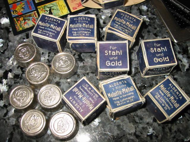 was ich aber witzig fand, man liebäugelt ja auch mit büchsen und verpackungen…und siehe da steht gold und stahl…. ich sammlte diese zusammen ohne mich gross zu achten was es sein könnte…zuhause habe ich es geschnallt…das ist wohl uralt zahnplombenmaterial…