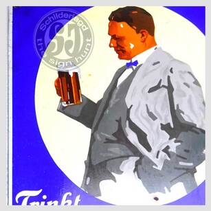Mit zeittypischen Abbildungen aus dem Orient Moschee und Kamele. Eines der wenigen Emailleschilder mit Goldaufdruck/Goldemaille. In dem Zustand ist es nicht oft anzutreffen.