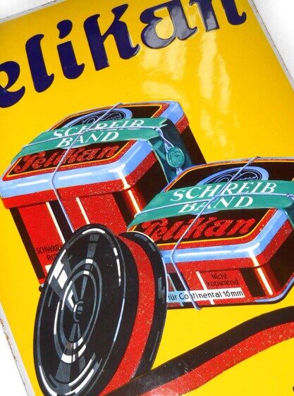 Nach 30 Jahren aktiver Jagd nach dem damals absoluten Highlight und unbezahlbaren historischen dynamischen Reklameschild Pelikan Schreibbänder, ist es endlich gelungen. Der Entwurf der neuen Sachlichkeit vom Grafik Professor Lucian Bernhard (Problem, Stiller Schuh, Manoli usw) aus Berlin dann New York, war auf dem Cover des mit ersten besten Schilderbuches von Prof. Wunderlich u. Sylke Wunderlich aus Leipzig und dabei ständiger Wegbegleiter.  Nun nach so vielen Jahren nicht mal als Grotte gefunden vor paar Jahren eine Version aus Holland mit sehr teuren ca. 22 000 Euro erreichte, nun doch endlich der Erfolg. Mehr demnächst unter den Expertisen.