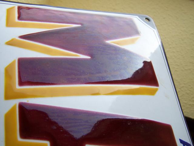 Das Schild sieht heute zum ersten mal Sonnenlicht 🙂 natürlich war es original Verpackt Zustand 0++++++++, ungehangen, Jungfrau, ja klar mit Paperetiketten ohne nur den Ansatz von Rost, patina irgendwas bla bla bla , ich drehte das Schild hin und her im Sonnenlicht , über den Buchstabe fällt dann ein regenbogenartiger Ölschimmer (lässt sich aber nicht wegwischen und sieht man nur in der Sonne) Sieht aus wie Öl im Wasser , Lichtspiegelungen.