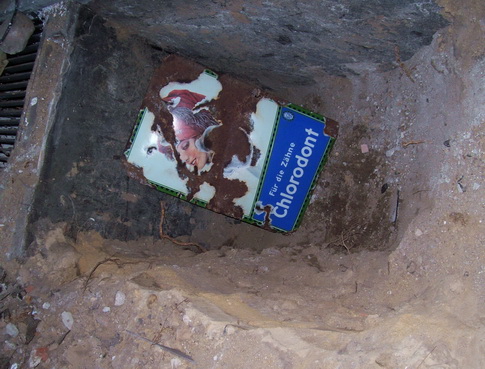 mit knapp 6 m wohl das größte und längste Schild von Chlorodont der Welt noch verschmutzt geht für ein Appel und ein Ei überm Ladentisch.