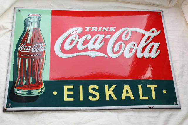 Jora hat nun mit seinem tollen Fund /Kauf die Cola Welle erst recht zum schwappen gebracht, da kommt schon das nächste Cola Schild diesmal aus den 50er (unten sogar mit Jahreszahl und Langlöchern) auf dem Tisch serviert. Dazu gibt es ein original Foto mit Schild und Kneipe (nach Bedarf) und eine Geschichte aus dem Leben eines Cola Schildes von damals bis heute 🙂 Lesenwert. Nur die Größe wäre noch gut zu wissen 🙂
