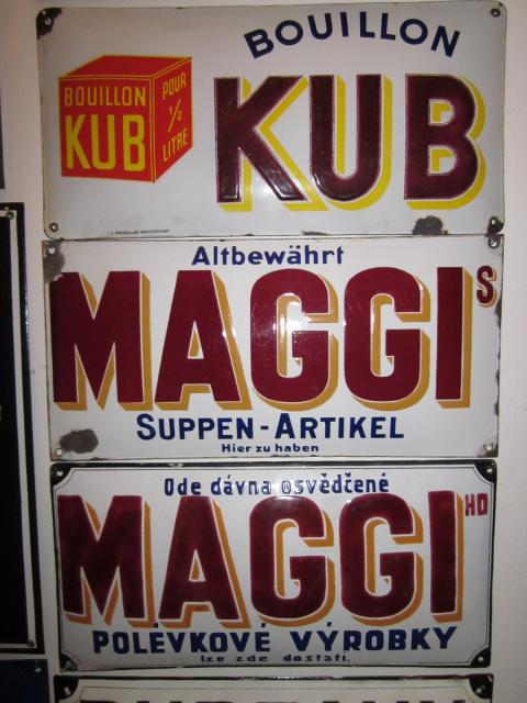 Wahrscheinlich bin ich der einzige Schildersammler, der noch kein deutsches Maggi gefunden hat(te) – klar für entsprechende Kohle sind immer welche auf Börsen etc. zu haben – aber ich finde so ein Schild muß „erjagd“ werden (schließlich hat man ja auch seinen „Jagdstolz“ 😉 ) – ha, und gestern hat es dann endlich geklappt und das für schlappe 25 Euro auf einem recht unspektakulären wöchentlichen Flohmarkt in Aachen, wo man sonst schon froh ist, wenn man mal ne nette Dose findet. Paßt gut zwischen ein französisches Kub und ein tschechisches Maggi.