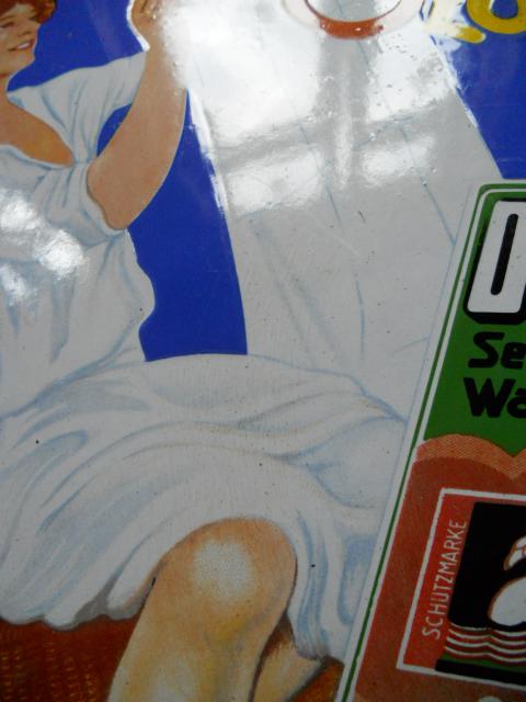 gehört mit zu den schönsten und gesuchtesten deutschen Schokoladenschildern und ist auch restauriert sehr wertvoll. In Berlin prof. restauriert.