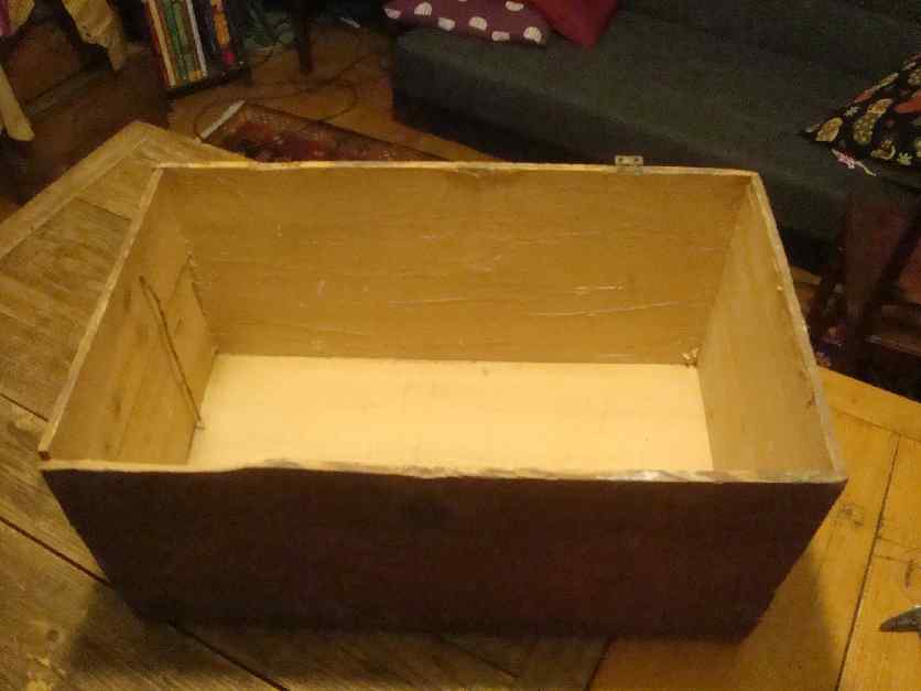 Das Holz in ordentlichem Zustand und vor Allem Bewohnerfrei, war es aber nicht was mich lockte, sondern die Innenseite des Deckels!