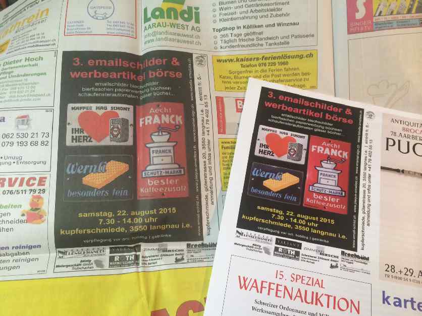 dazu gibt es eine geschichte…. vor paar jahren hatte ich noch einen kleinen brocanteladen den ich fraitag nachmitag – abend offen hatte…. eines abends fuhr ein alter hürlimann traktor vor…. ich dachte noch die käserei ist doch auf der anderen seite der kreuzung… ein grossvater. kam herein unter dem arm hatte er einen juttensack in dem das maggi schild oben links eingepackt war… mit dem riesen schlag im A….. er sagte er habe mein inserat gelesen und habe noch dieses schild gefunden…. ich wusste gar nicht was ich sagen soll er freute sich so sehr dass er ein schild hatte…. aber wie bringe ich ihm bei das der zustand … naja mässig ist…. wer redeten, ich zeigte ihm meine im laden … er merkte das der zustand nicht top war, und er sagte stolz er werde das restaurieren und nochmals kommen…..