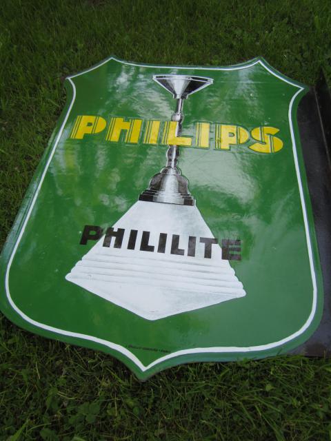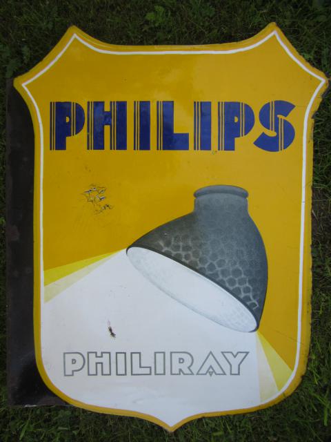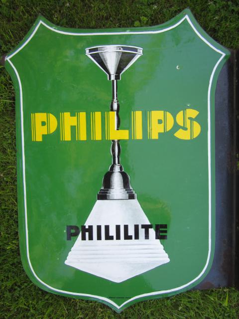 Moin, jau Henk hat richtig getippt. Es handelt sich um einen Ausleger von Philips (73 cm x 55 cm, hergestellt in Frankreich, ca. 20er Jahre). Hier werden in deutlichem und eindruckvollem Art Deco die Lampentypen „Phililite“ und „Philiray“ beworben. Sehr schön ist auch die Buchstabengestaltung von Philips. Mir war dieses Schild bis gestern völlig unbekannt doch dann ist mir „ein Licht aufgegangen“ und es mußte einfach in meinem Kofferraum 🙂