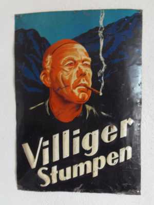 Diesen markanten Herren habe ich hier schon mal gezeigt, er wurde dann Mister Reklame 2013 (http://www.schilderjagd.de/?p=42423). Hier noch einmal im Ganzen, gewölbt, geprägt. Villiger Stumpen in der seltenen „blauen“ Variante.