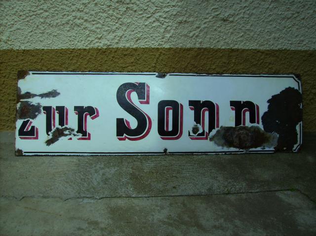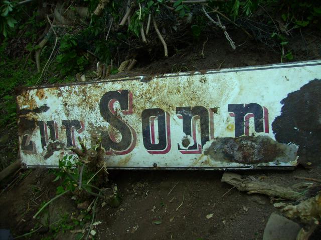 Hier eine Echtheitsanfrage stellen War vorhinpict0043.JPG unterwegs bewaffnet mit Spiegel, Säge und Schäufelchen um endlich zu erfahren was für ein Schild da von einem Baum eingewachsen ist. Beim ersten Blick mit ’nem Spiegel unter das Schild konnte ich nicht viel erkennen, ausser Maggirot! Habe mich schon auf eine mir unbekannte Maggi Variante gefreut…. Angestachelt von Adrenalin und Neugier habe ich dann geschuftet wie ein Wilder und so nach und nach die Wurzeln und Erde entfernt bis ich es endlich seitlich rausziehen konnte. Doch was war daß ???, keine neue Maggi Variante und überhaupt gar kein Reklameschild, war ( bin ) echt enttäuscht von der Entdeckung, was hab ich mir in den vergangenen schlaflosen Nächten nicht alles vorgestellt was da drauf  sein könnte….. Na ja hätte ja sein können. . Habe es trotzdem mitgenommen und gerade fertig geputzt, das Teil ist sauschwer, extrem dickes Blech  und 45/155 cm groß. Auf jeden Fall war es mal wieder richtig g… in freier Wildbahn unter solch aufregenden Umständen (vom Wasser aus) überhaupt was zu finden.pict0044.JPGpict0045.JPGliebe Grüße Stephan