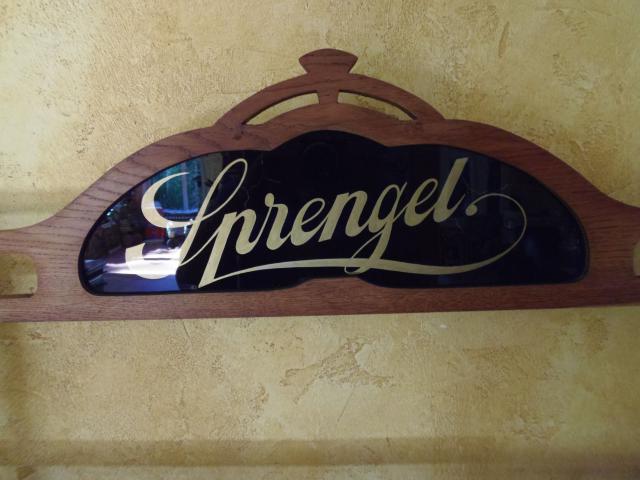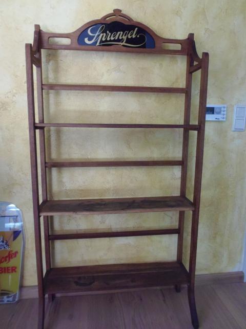 Sprengel-Verkaufsregal, Jugendstil um 1910. Oben eingearbeitet ein Glasschild, welches erstaunlicherweise die letzten 100 Jahre unbeschadet überstanden hat.