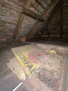 Moment…die Laderampe ist überdacht und hat einen Dachstuhl. Dieser ist von unten verbrettert also muss es doch einen kleinen Speicher wie bei einem Giebel geben. Ah da, über dem Schiebetor das zu den Gleisen führte. Puh das ist aber hoch. Keine Leiter, na dann hilft nur klettern. Gesagt getan. also Fuß auf nen Querbalken die Hände an die Laufschiene des Schiebetors und dann hochgezogen.