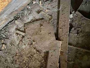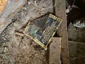 Kennt ihr das Gefühl? Diese Mischung aus: gibts doch gar nicht und ich hab`s doch gewusst. Als ich da so hangelte realisierte ich dass der Salamander quasi vorne zusammen und hinten auseinander war. Also das hintere Drittel fehlte. Mist. Ist das vielleicht noch da? Unter der Staubschicht sah plötzlich jedes Brett wie das fehlende Teil aus, aber das da drüben könnte es doch sein oder. Den Bretterboden zu betreten habe ich nicht gewagt. Also erstmal den Salamander mit einer Hand langsam so weit es ging zu Boden lassen und parallel dazu absteigen und auf der anderen Seite des Tors wieder aufsteigen. Als ich das Fragment soweit sicher am Boden hatte, ging ich zur anderen Seite. Ich stieß dabei mit meiner Fußspitze ein Blech das man am scharrenden Geräusch sofort erkannte….