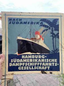 Das Schild der „HAMBURG SÜD“ fasziniert mich. Es ist ja eindeutig ein Vorkriegsschild (die Cap Arcona wurde 1945 versenkt) und hat somit fast 100 Jahre auf seine Entdeckung in der bayrischen Provinz gewartet. Ich stelle mir die großen Augen der Landbevölkerung 1929 vor wenn sie den Fahrplan gelesen haben mochten. Mit Namen von Städten die auf sie wie ein Traum gewirkt haben mögen.
