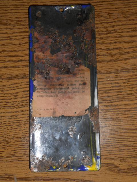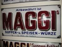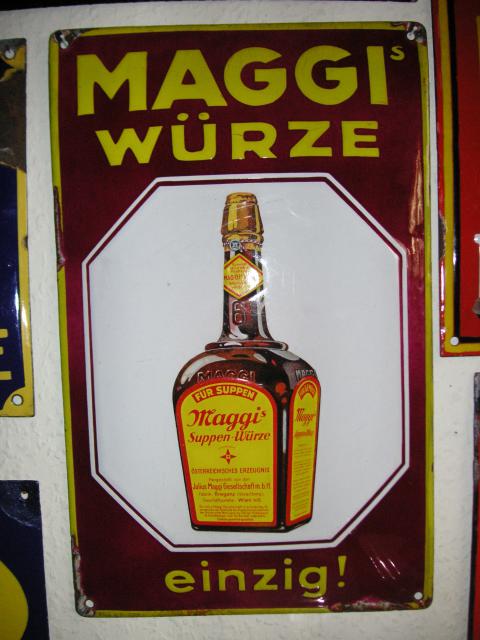 … aber damit nicht genug. Mensch, da ist ja noch ein Schild in Papier eingeschlagen. Anhand des Gewichts ließ sich schon erahnen, dass es nur Emaille sein konnte. Umschlag für Umschlag legten wir das gute Stück frei! Das Gefühl hat sonst nur der kleine Klaus, der das erste Mal Brüste sieht! GEILOMAT! Goldschatten, seltene Ausführung! Ein Maggi im Zustand 0 – ungehangen! Jungfräulich wie der kleine Klaus!