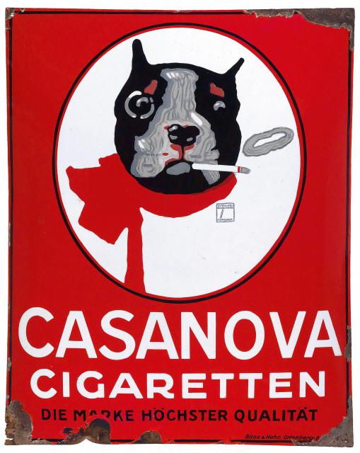Eine Bulldogge mit Monokel steht für Casanova Cigaretten – eines dieser seltenen Zigaretten-Emailschilder aus Deutschland der 1920er Jahre.
