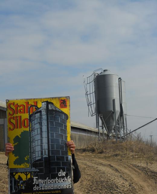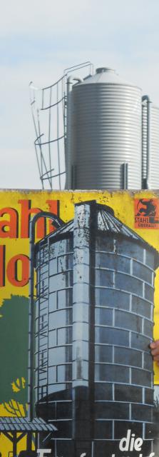 Ob es Verbindungen mit der Verherrlichung aufstrebender deutscher Industrie in den 30er zum Entwurf Stahl Silo gab, ist fraglich. Die pompöse Wirkung des Silos als Futtertrog der Nation? Es könnte sicher eine Anspielung auf die Folgejahre sein, denen er ebenfalls wie Hohlwein und andere Grafiker verfallen war. Wenn man den mittleren Link bei Wikipedia anklickt wird einem Angst und Bange. U. a auch Willy Holzapfel als Maler zu finden.